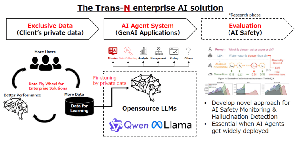 Trans-N proposes a system infrastructure that utilizes open-source LLMs within a private environment. This setup alleviates information security concerns, allowing companies to safely deploy AI. By taking advantage of the open-source nature of LLMs, it is possible to redevelop and retrain the models. Internal knowledge and data collected during AI use are integrated into the AI, enabling it to better understand and evolve with a company’s operations. As a result, a growth cycle is established where the AI provides more accurate responses, increasing user engagement and generating new data.
