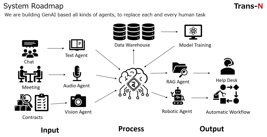 Expanding upon the above methods, Trans-N is working on developing various agent systems for businesses. If we consider AI as a “brain,” we aim to equip it with “eyes,” “ears,” and even “hands” and “feet,” enabling AI to operate effectively in the physical world. By connecting numerous AI agents to an AI “brain,” we enhance human knowledge, decision-making, and support real-world actions.