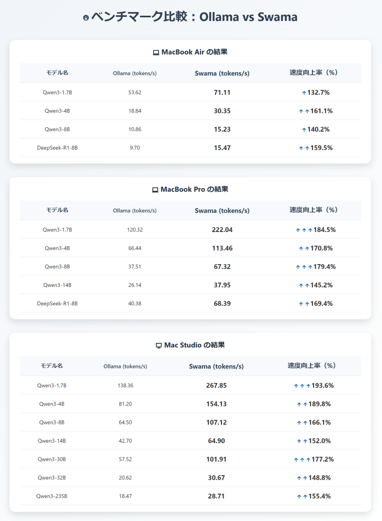 ローカルLLM実行基盤で最も広く利用されているOllamaをMacOS向けに最適化するため、Apple純正プログラミング言語「Swift」と、Apple開発の機械学習フレームワーク「MLX」を採用し、Apple 純正スタックでゼロから開発しました。その結果、Macの各機種・モデルでの検証において、基準のOllamaより処理速度を約1.5~2.0倍に向上させることに成功しました。※