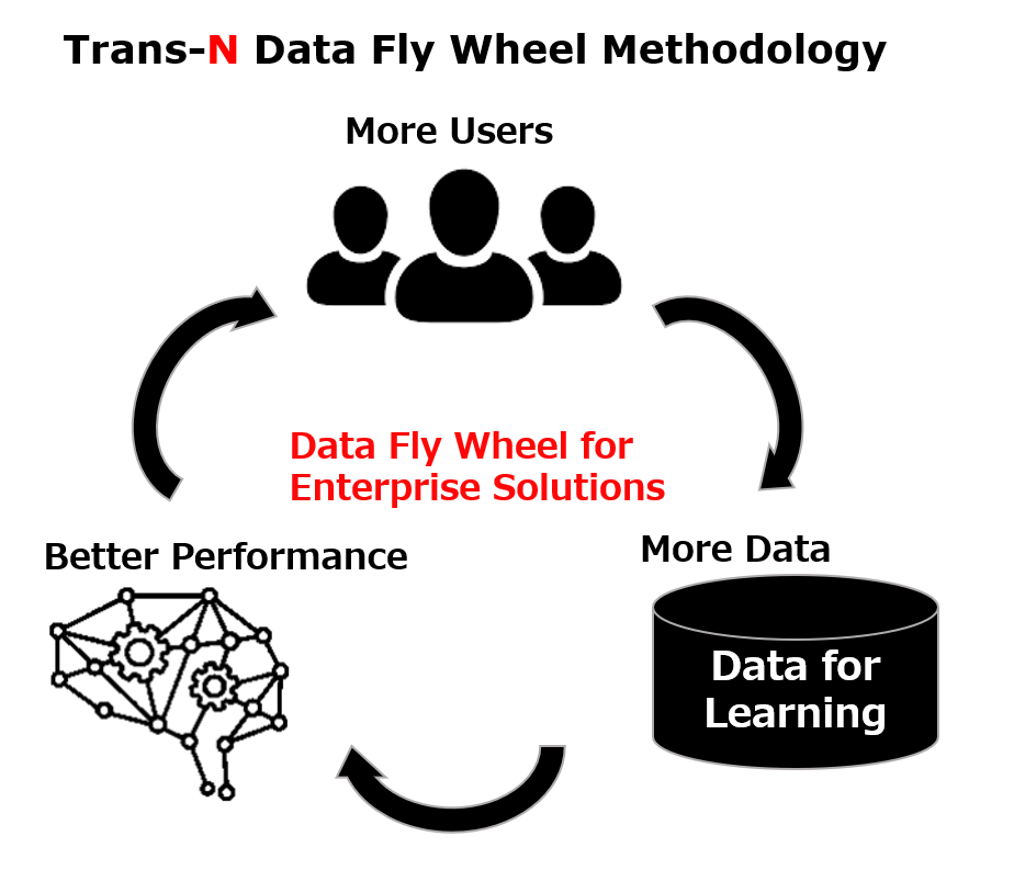 Trans-N proposes a system infrastructure that utilizes open-source LLMs within a private environment. This setup alleviates information security concerns, allowing companies to safely deploy AI. By taking advantage of the open-source nature of LLMs, it is possible to redevelop and retrain the models. Internal knowledge and data collected during AI use are integrated into the AI, enabling it to better understand and evolve with a company’s operations. As a result, a growth cycle is established where the AI provides more accurate responses, increasing user engagement and generating new data.