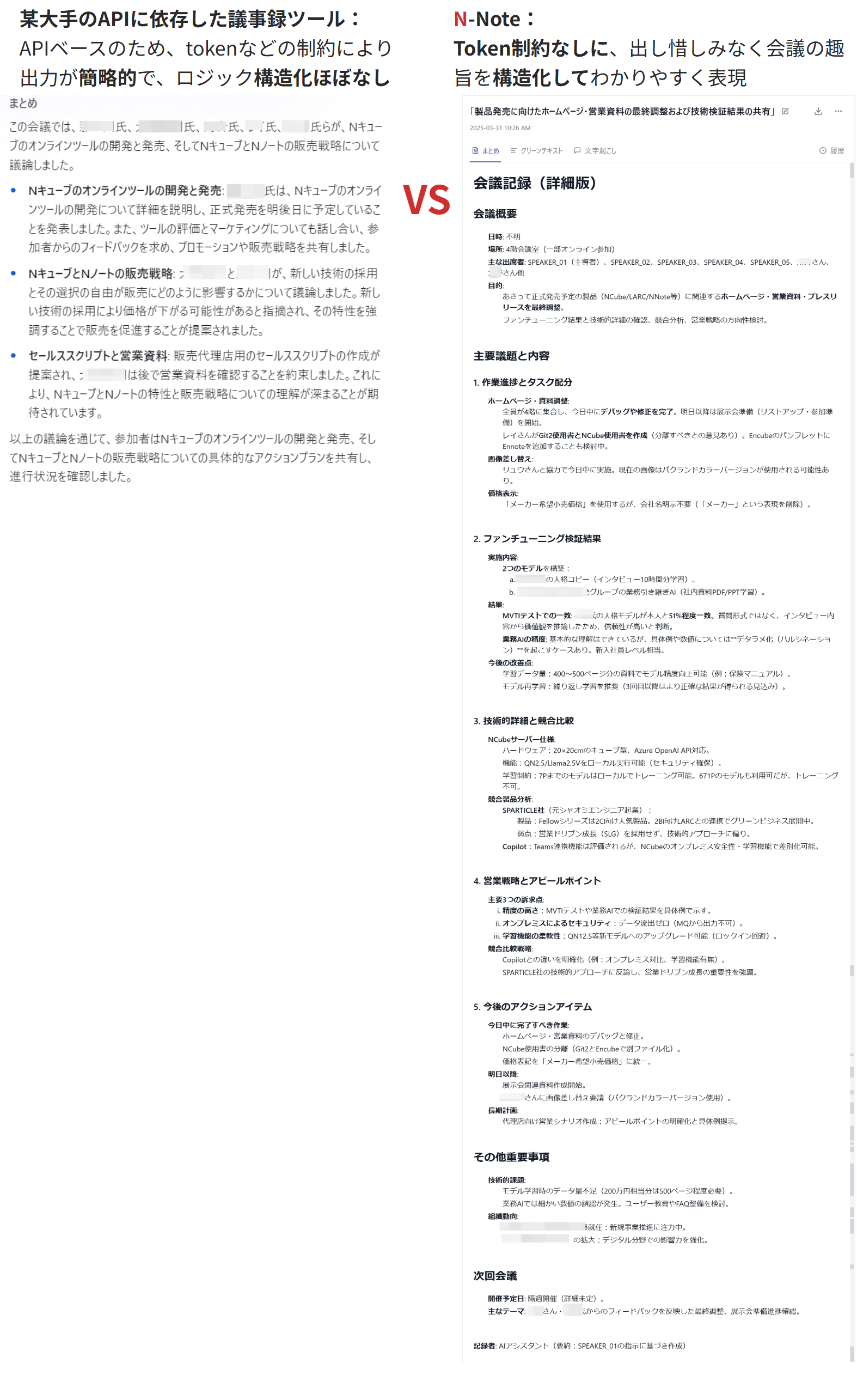 同じ音源からの出力を他社製品と比較しても、オープンソースLLMによるローカル推論のメリットを最大限に生かした議事録の精緻さが一目瞭然です。