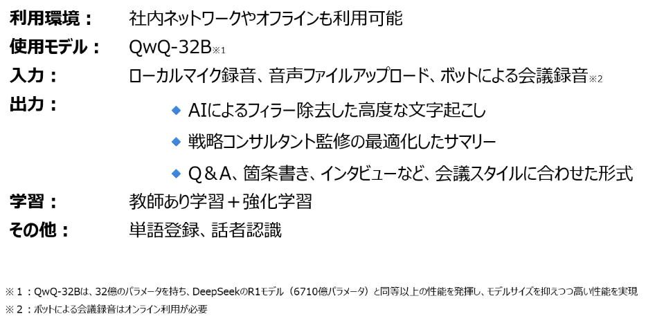 - 戦略コンサルタント基準の最高品質の生成AI議事録、チャットボット