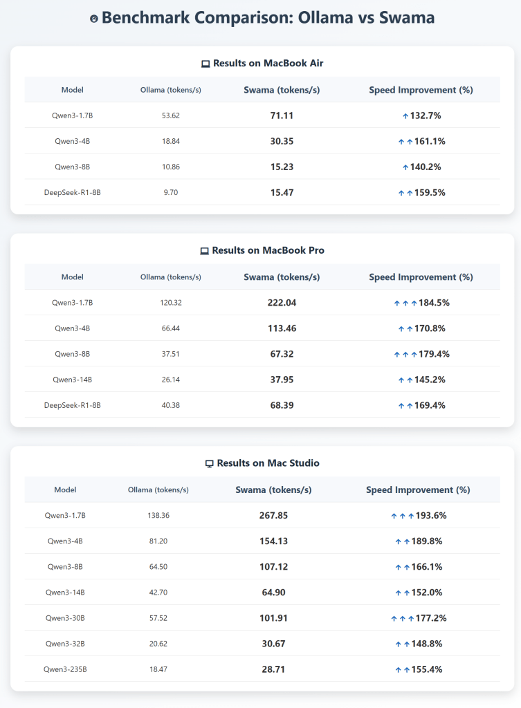To optimize the most widely used local LLM runtime, Ollama, for macOS, Swama was built entirely from scratch using Apple’s native technologies—the Swift programming language and the MLX machine learning framework developed by Apple. Leveraging Apple’s native stack has allowed Swama to achieve significant performance improvements. In benchmark tests across various Mac models, Swama demonstrated approximately 1.5 to 2.0 times faster processing speeds compared to the baseline performance of Ollama. *
