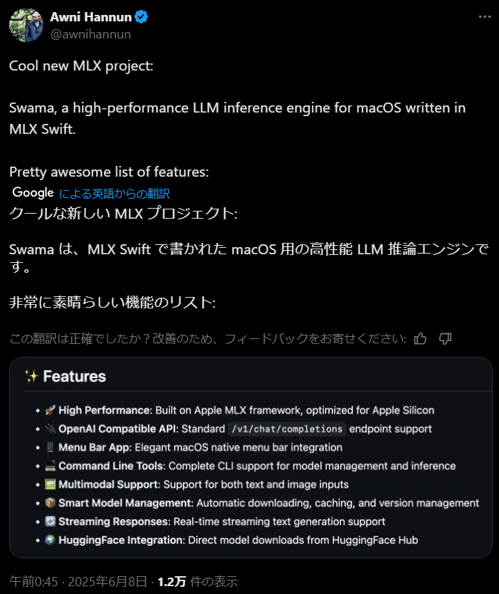 Swamaはリリース後Appleの機械学習リサーチサイエンティストのAwni Hannun氏(論文引用数26,000回以上)により高く評価されています。