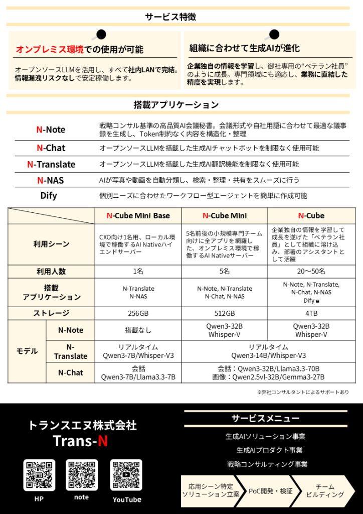 生成AIプロダクトを企画・開発するトランスエヌ株式会社(代表取締役CEO:那 小川、以下 Trans-N)は、10月8日(水)〜10月10日(金)に幕張メッセで開催されるNexTech Week【秋】(AI・人工知能EXPO)に出展します。会期中は、ハードウェア一体型AIプラットフォーム「N-Cube」と、その上で動くN-Note(議事録)/N-Chat(チャット)/N-Translate(翻訳)/N-NAS(AI NAS)などのアプリ群を、実機でご体験いただけます。