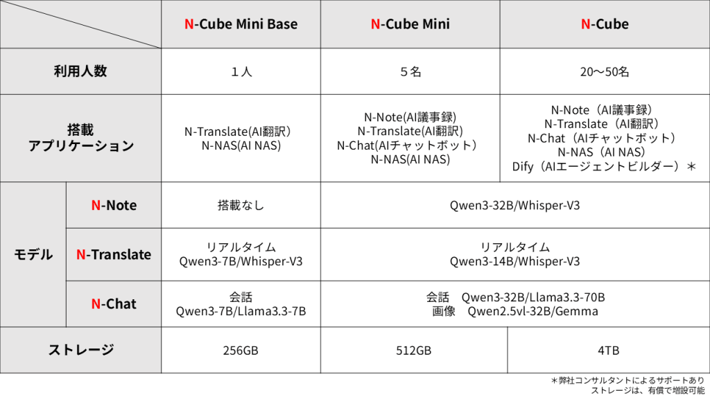 - またN-Cubeの本体、プラットフォームはオンラインアップデートに対応し、Trans-Nが検証済みの最先端LLM、ワークフロー、ベースシステムをいち早く実装、利用可能。
